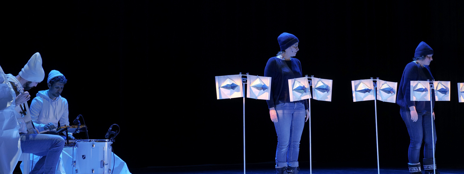 Sur scène, 12 bouches de papier portent cette parole imaginée par l’auteur Guillaume Poix. Deux comédiennes font délicatement dialoguer leurs voix. Fondre déroule une forme épurée, mêlant théâtre de papier, manipulation visible et musique jouée en live. Cette dernière dessine un paysage sonore organique ponctué de ballades folk et d’interludes au rock strident lorsque la glace craque. Le silence, lui, évoque la disparition.