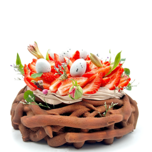 Une meringue moelleuse au chocolat, un praliné coulant amandes-noisettes, une compotée de fraises, une crème légère au chocolat Valrhona, parsemée de beaucoup de fraises Gariguettes.