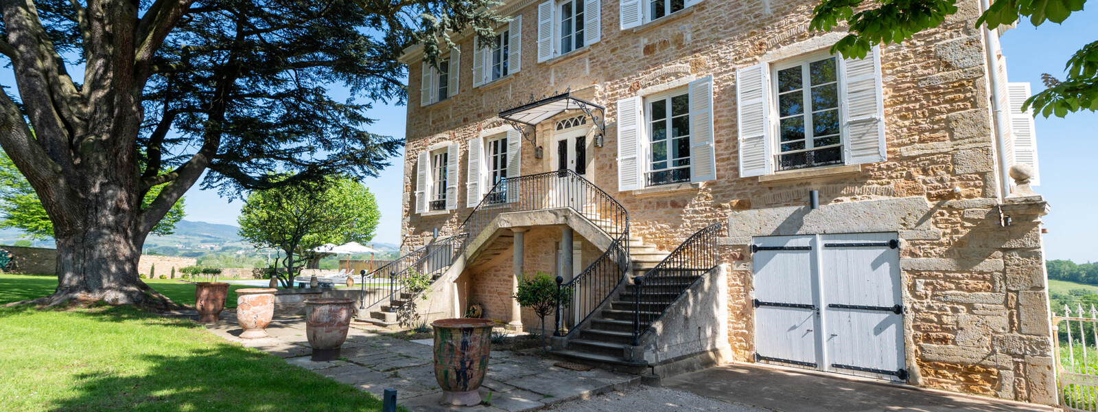 Propriété de famille dans le Beaujolais des Pierres Dorées pour 26 pers. (réparties sur 2 maisons indépendantes). 10 chambres, 3 cuisines, piscine chauffée dans un jardin clos, SPA intérieur. Kids friendly. Vignes à 360°C, vue dégagée sur le Mont Blanc !