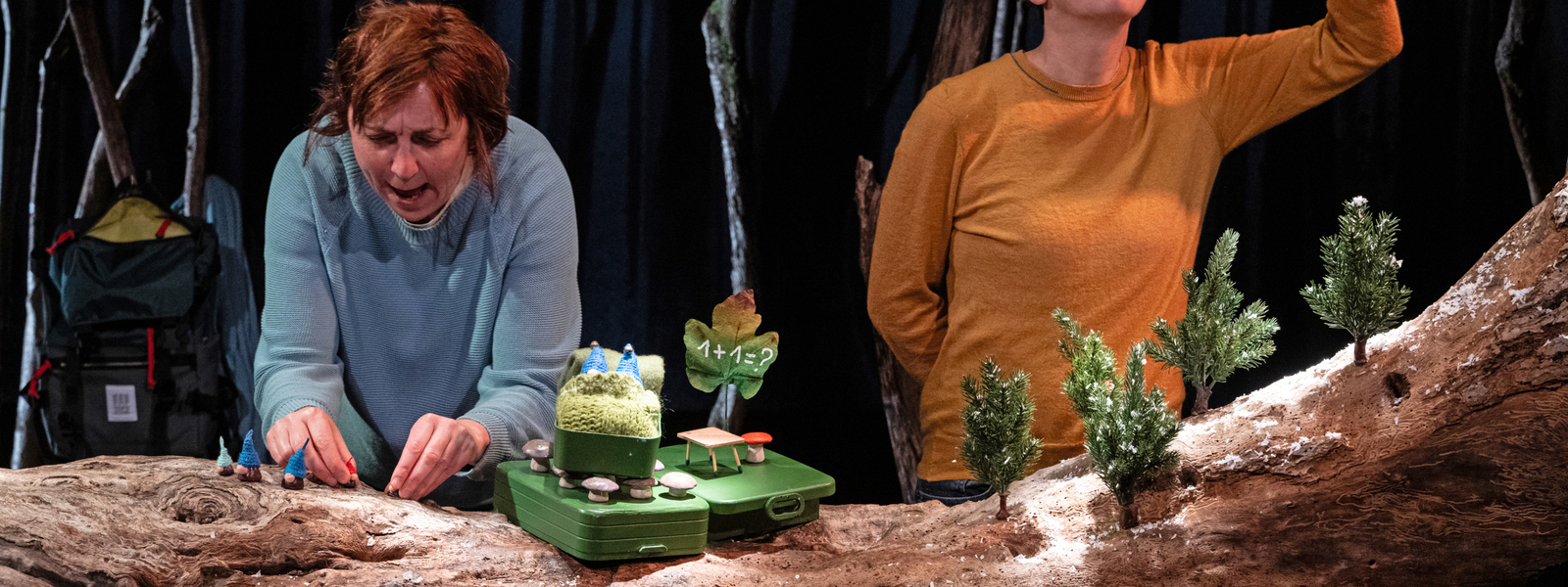 Partant du conte de Grégoire Solotareff, un farfelu récit teinté de comique et de gravité se déploie. Trois interprètes manipulent de petits êtres à bonnet de laine et prennent leurs mimiques et leur malice. Sur scène, on aperçoit le tronc d’un pommier : le village des lutins. L’incroyable scénographie de Valentin Périlleux (Alberta Tonnerre, au Ciel en janvier 2024) offre son lot d’inattendus et d’émerveillement. Cette paisible communauté sera bientôt le théâtre de bien des travers humains…