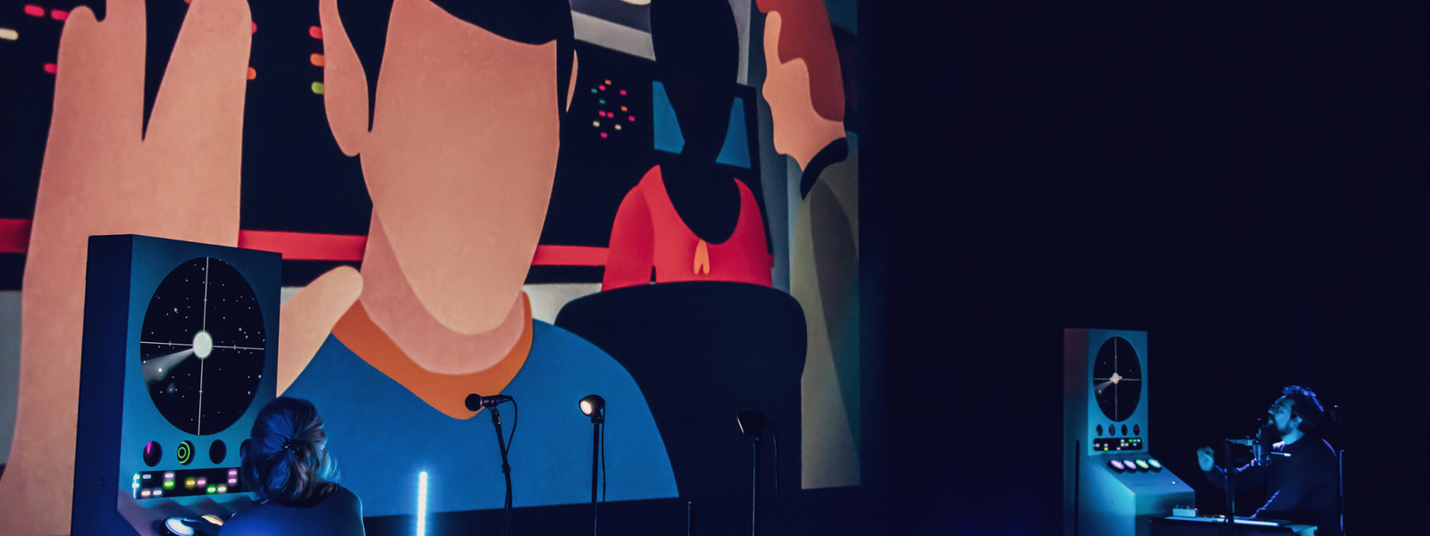 Deux interprètes font face à des machines futuristes et actionnent leurs leviers et boutons. Ces machinistes extraordinaires subliment alors la parole collectée grâce à des visuels animés et des ambiances sonores en direct. La musique se mêle savamment à l’univers apporté par les récits et illustrations : la nature nous enveloppe, le rêve carillonne, la ville électrise. Véritable passerelle entre le public et l’écran, la scénographie a été imaginée et modélisée pièce par pièce, pour que le moindre mécanisme ouvre tout un imaginaire.
