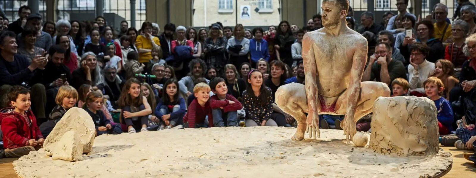 D’un côté, une harpe et sa harpiste. De l’autre, une piste recouverte d'argile blanche avec en son centre un jongleur – vêtu d’un élégant costume – et sa balle.